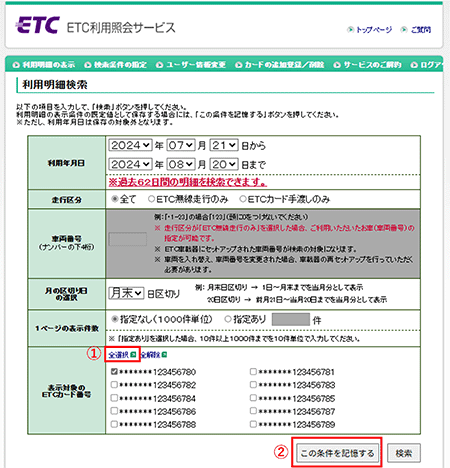 - @「表示対象のETCカード番号」の項目で「全選択」をクリックしてください。