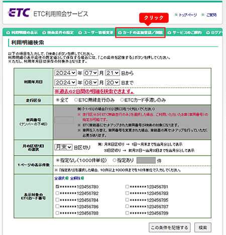 - ご登録のETCカード番号に変更はございませんか。変更がある場合は、画面上部のツールバー「カードの追加登録/削除」からETCカード番号の追加をお願いします。